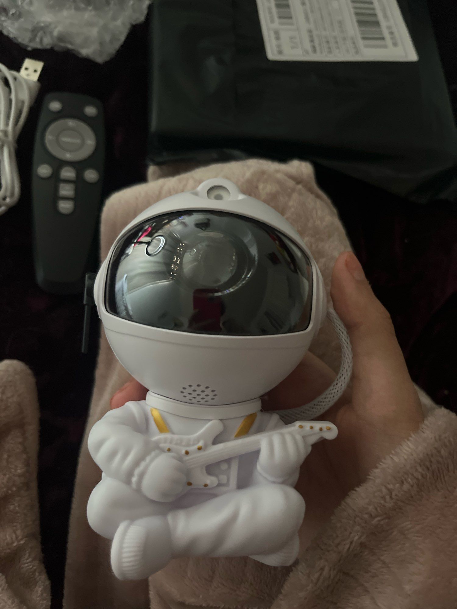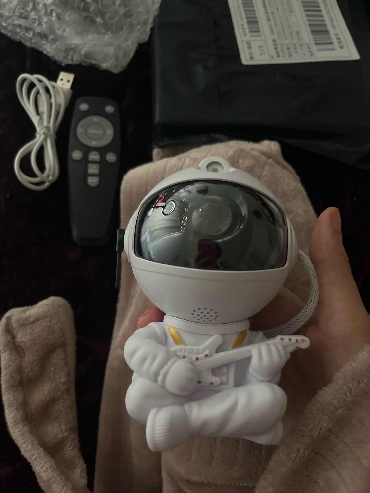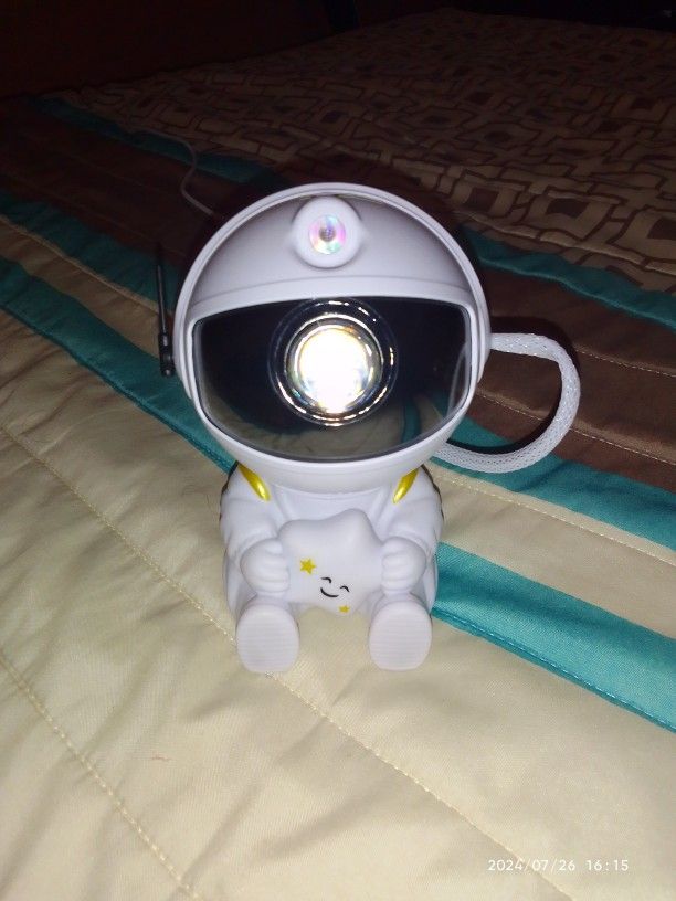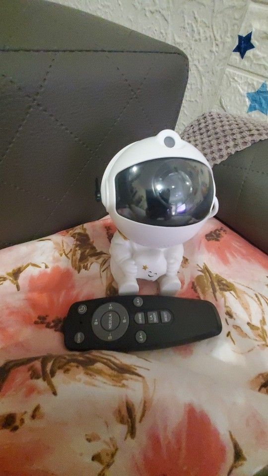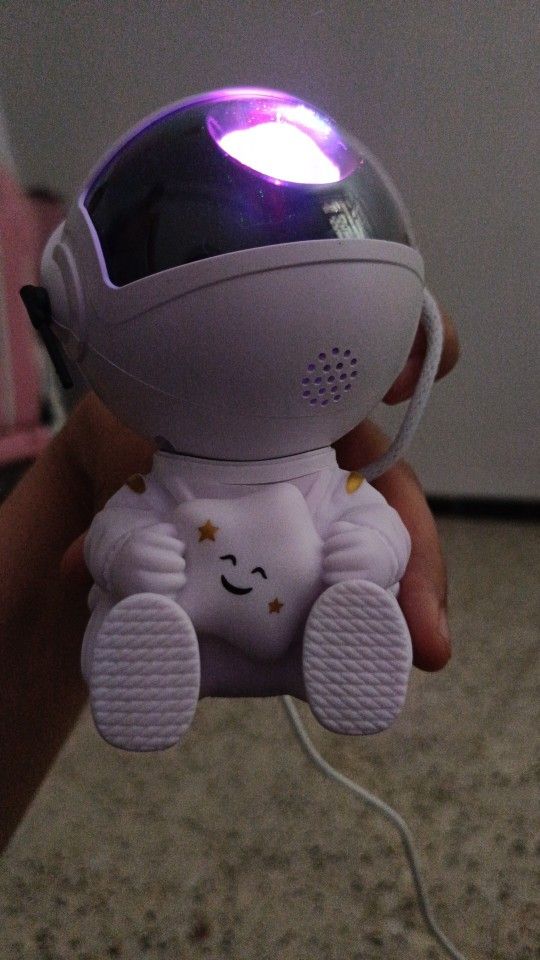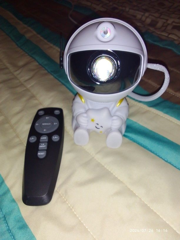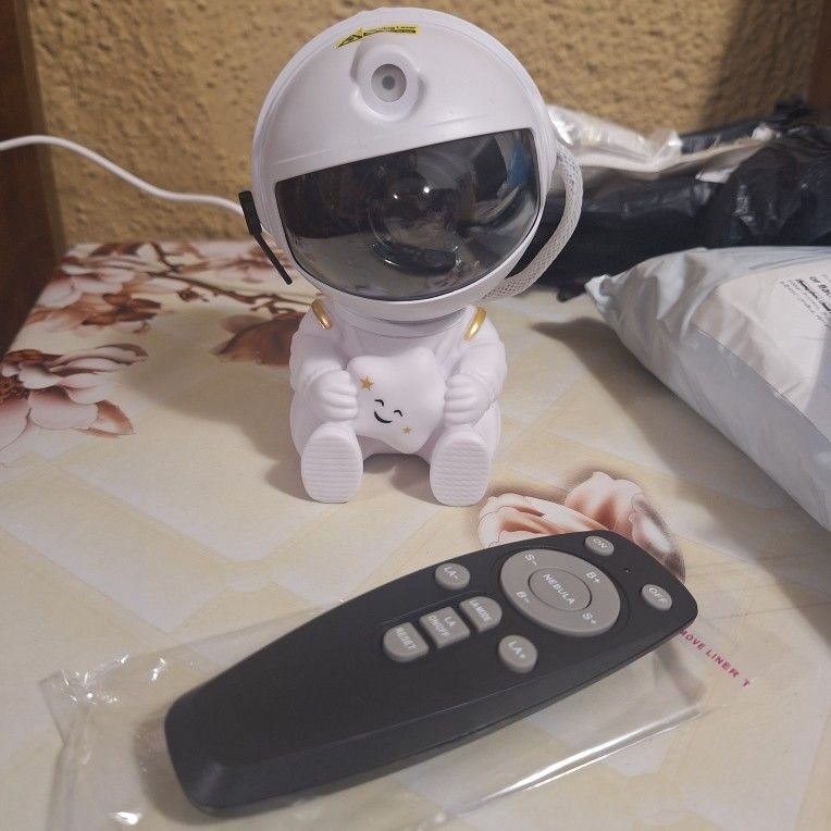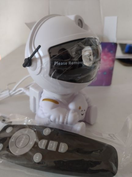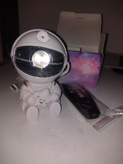 Very cool projector, the package was not damaged, the package includes: Projector, remote, C-tab cord. The project itself also has 3 control buttons. Can adjust the shades, brightness level, the astronaut head itself is movable and can set as you like! The children liked it very much