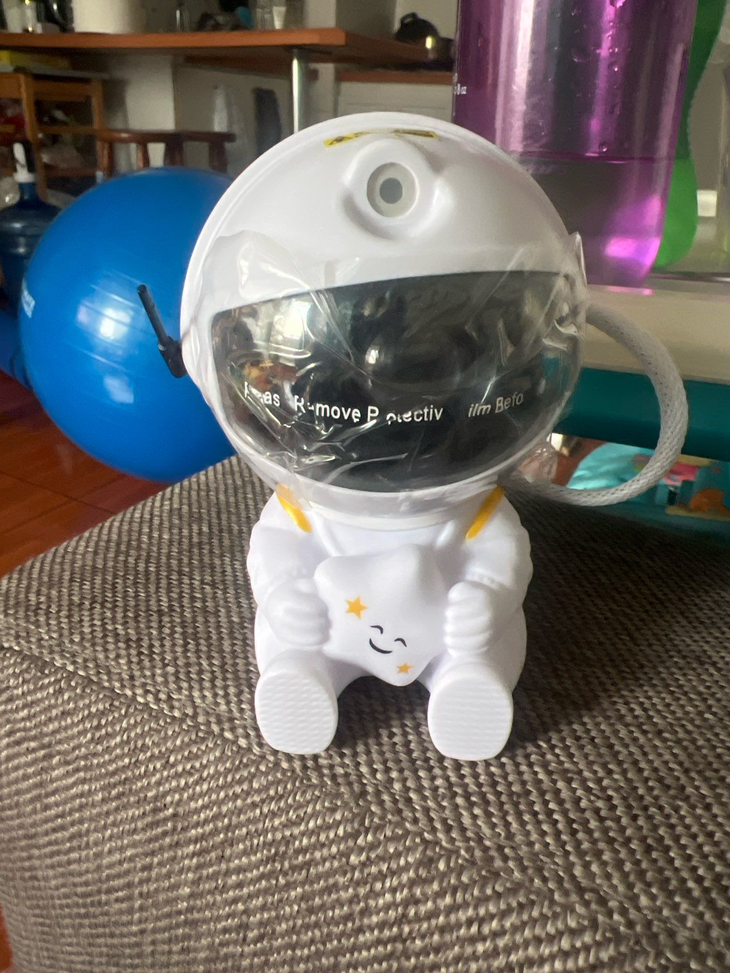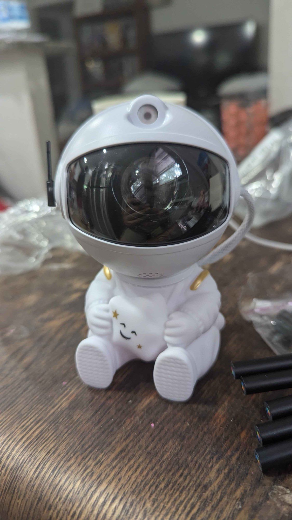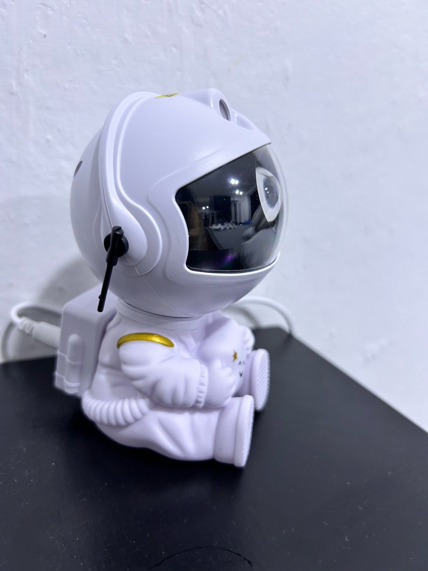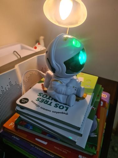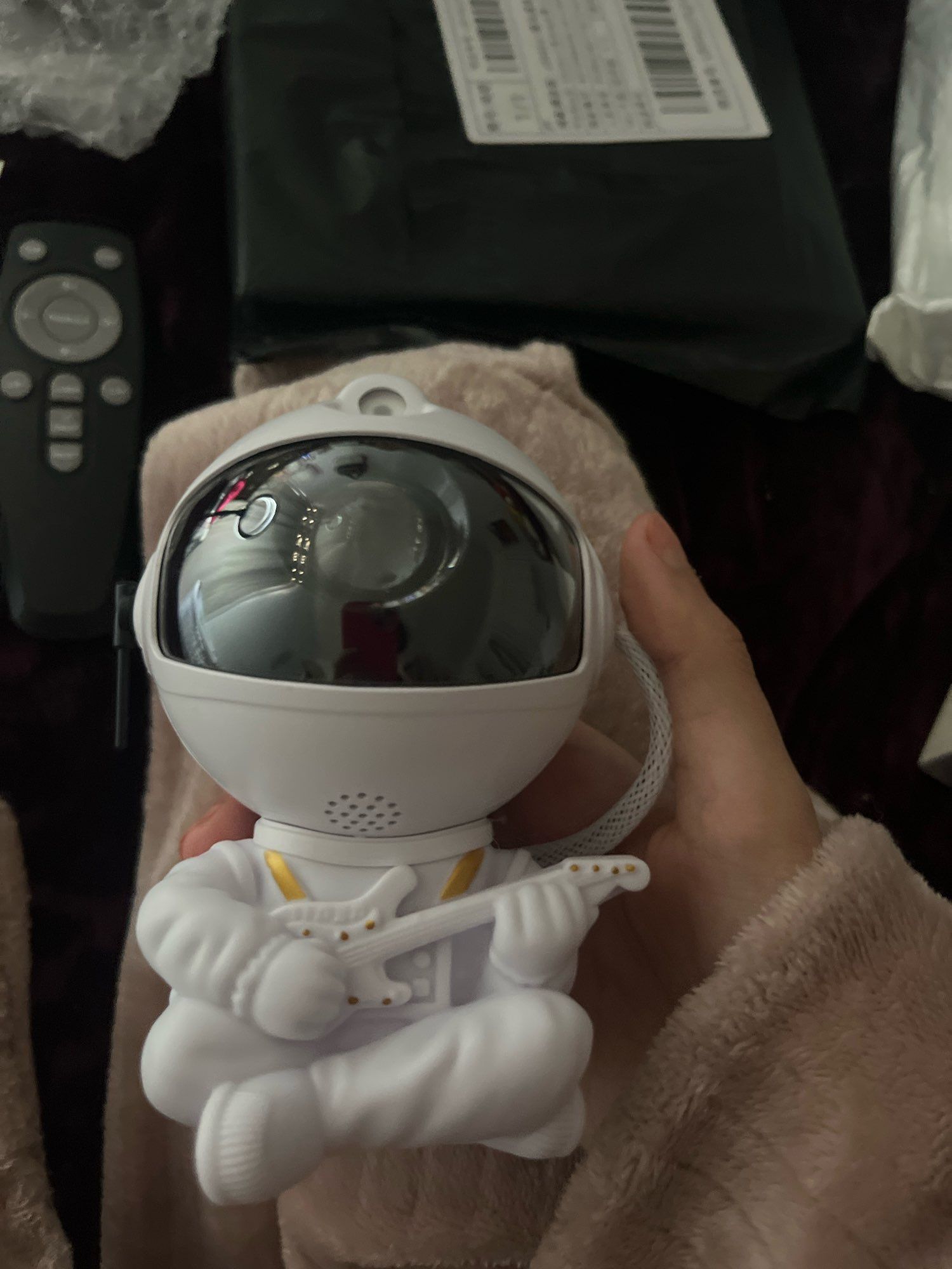 Very cool projector, the package was not damaged, the package includes: Projector, remote, C-tab cord. The project itself also has 3 control buttons. Can adjust the shades, brightness level, the astronaut head itself is movable and can set as you like! The children liked it very much