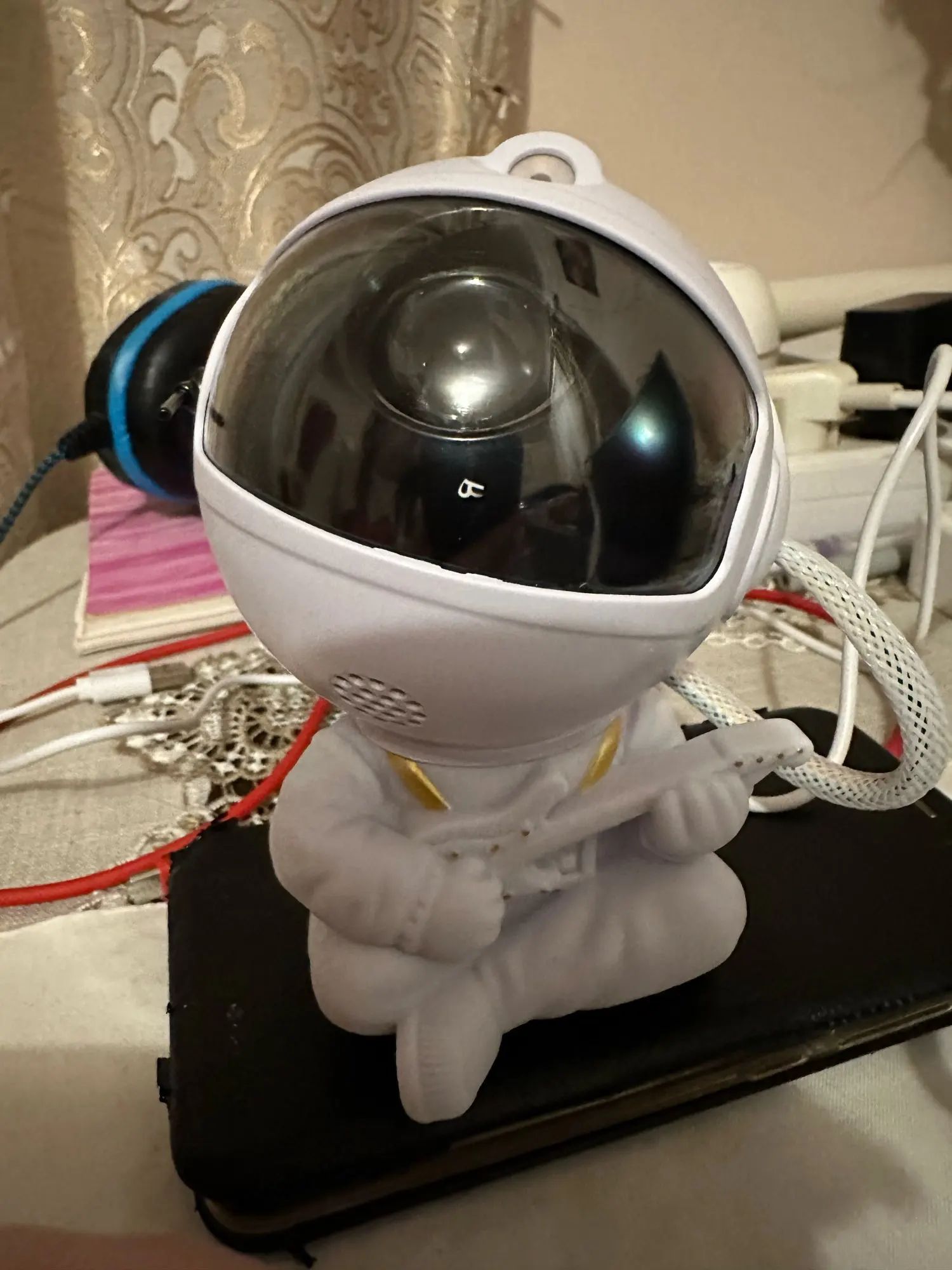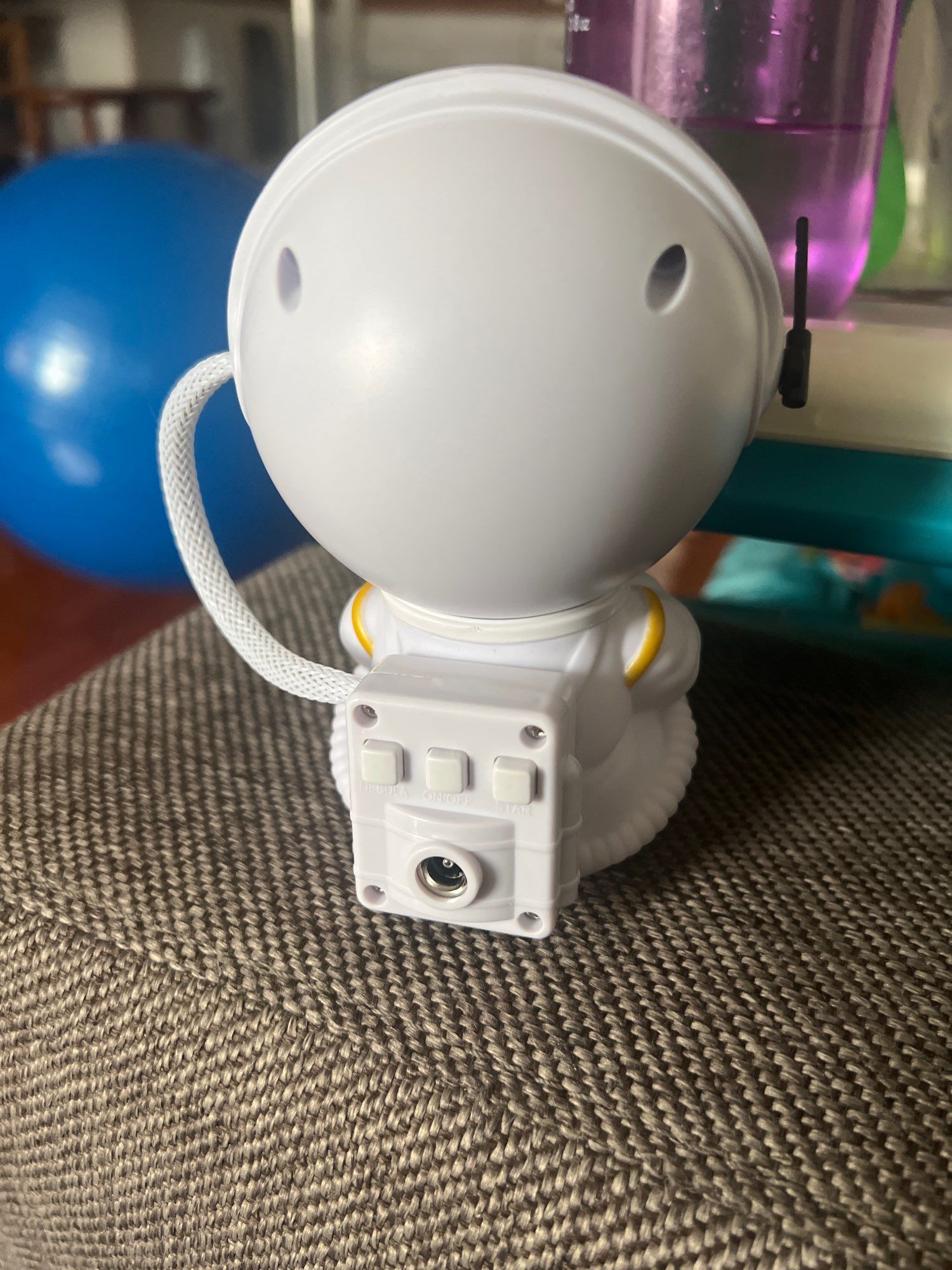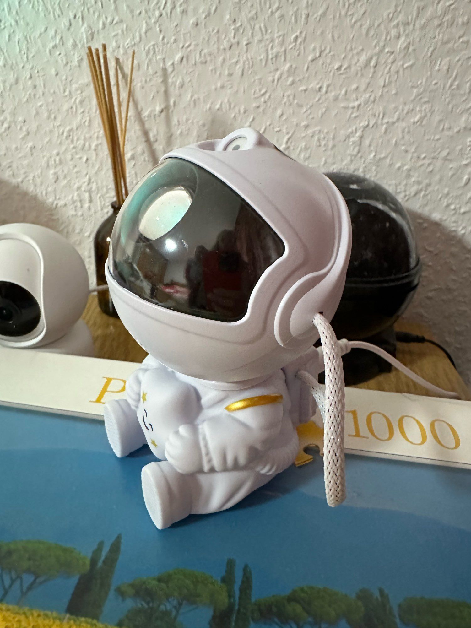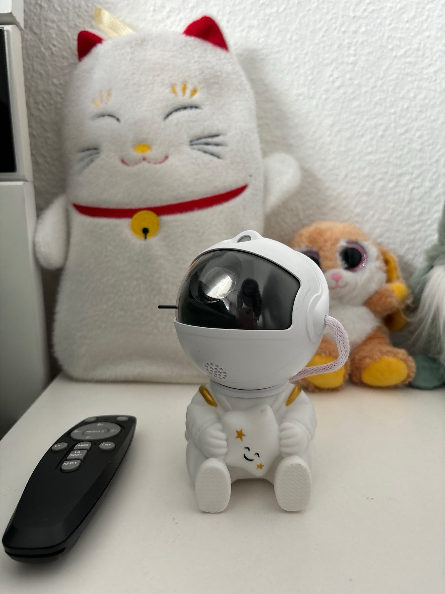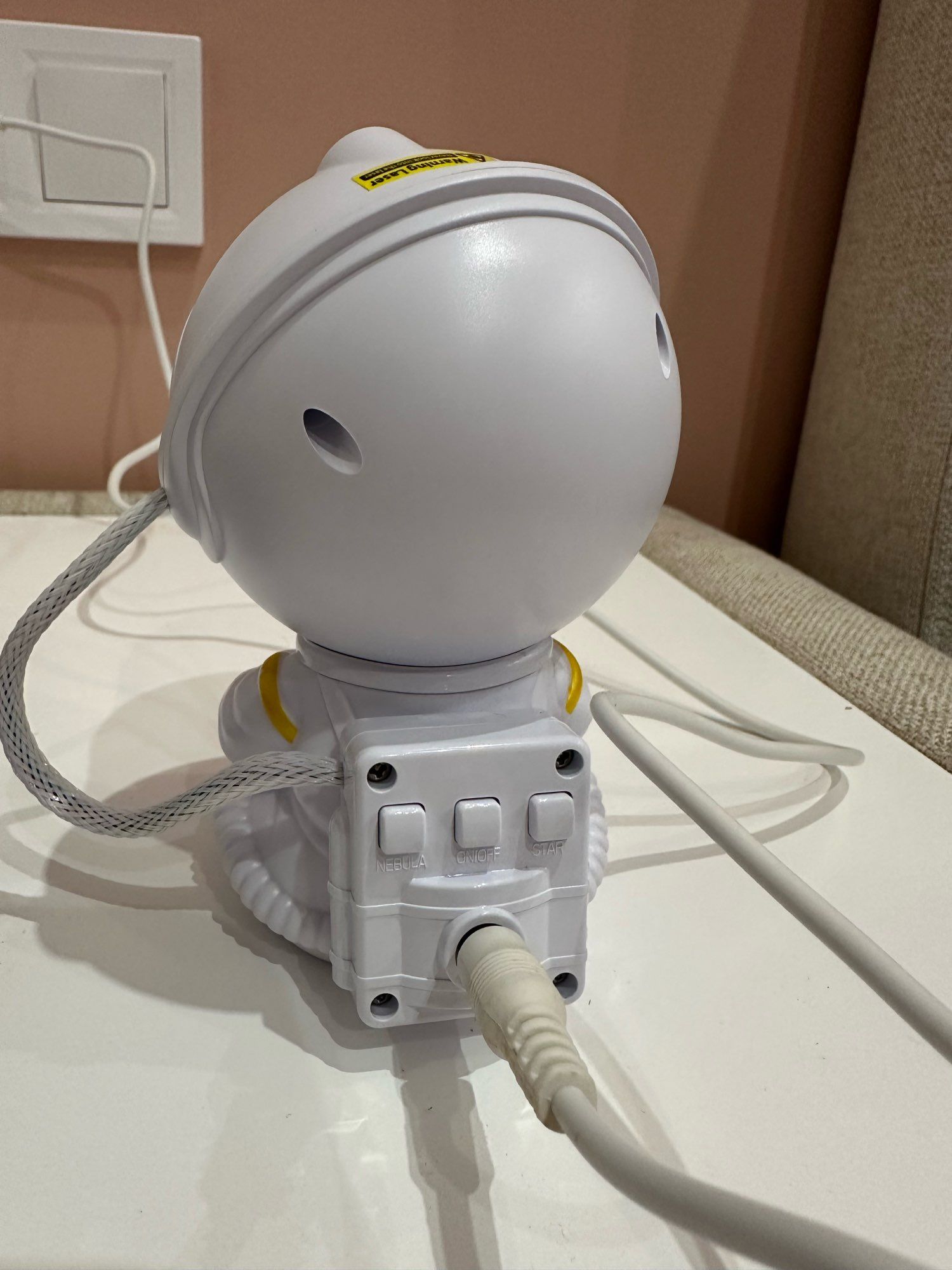 Very cool projector, the package was not damaged, the package includes: Projector, remote, C-tab cord. The project itself also has 3 control buttons. Can adjust the shades, brightness level, the astronaut head itself is movable and can set as you like! The children liked it very much